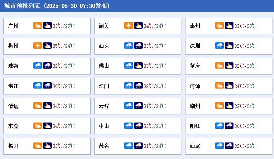 30日,珠三角南部和粤西沿海市县多云,有中到大雨局部暴雨,其余市县多云到晴,有分散(雷)阵雨。最高气温:中北部市县33~36℃,其余市县30~33℃。
